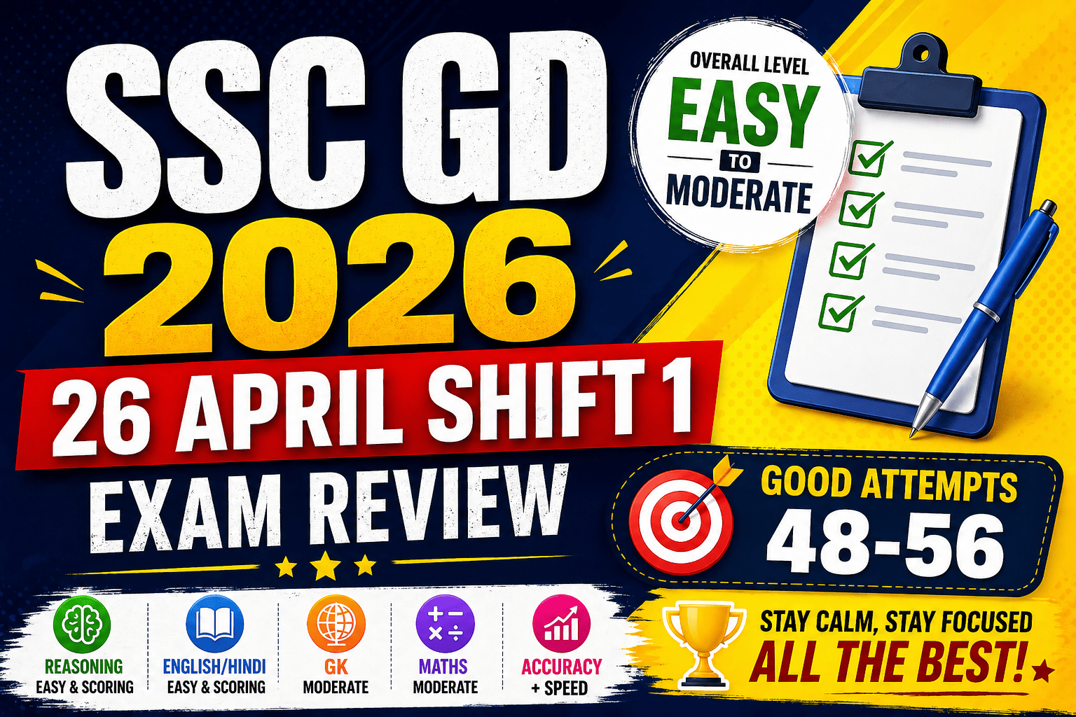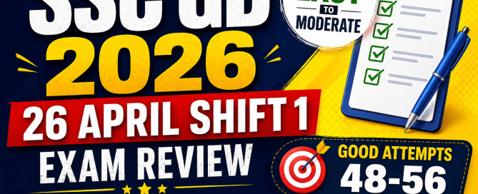 SSC GD Exam Analysis 2026: 26 April Shift 1 The SSC GD Exam Analysis 2026 for 26 April Shift 1 is based on feedback shared by candidates who appeared in the first shift. This detailed exam review will help aspirants understand the difficulty level, good attempts, section-wise analysis, exam pattern, and preparation strategy for upcoming shifts. As per candidate reactions, the overall level of the SSC GD 26 April Shift 1 exam was Easy to Moderate. Reasoning and English/Hindi were scoring, while GK and Mathematics [...]