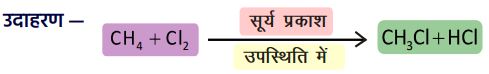 ➠ संतृप्त यौगिकों में उपस्थित परमाणु या परमाणुओं के समूह को जब कोई अन्य परमाणु या समूह प्रतिस्थापित करता है, तो उसे प्रतिस्थापन अभिक्रिया कहते हैं।