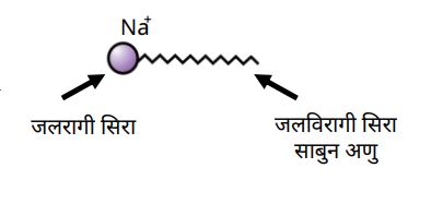 ➠ साबुन के अणु का वह सिरा जो हाइड्रोकार्बन में अर्थात् तैलीय मैल में विलयन होता है, उसे जलविरागी सिरा कहते हैं।