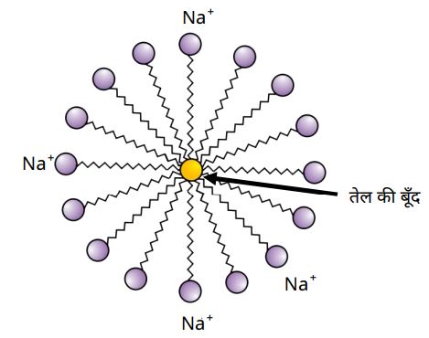 ➠ साबुन का आयनिक भाग जल में घुल जाता है, जबकि कार्बन श्रृंखला तेल में घुल जाती है।
