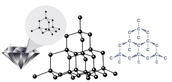 - ➠इसमें प्रत्येक कार्बन परमाणु कार्बन के अन्य चार परमाणुओं से जुड़कर एक कठोर त्रि-विमीय संरचना बनाता है।