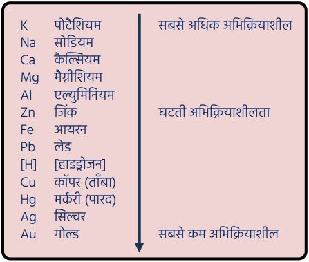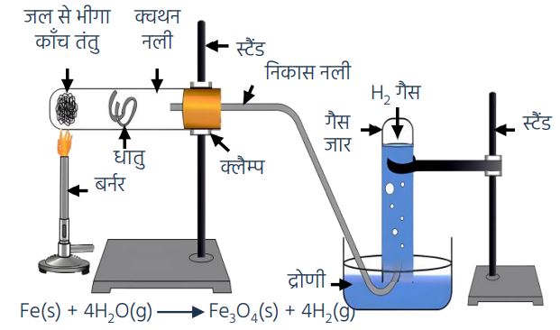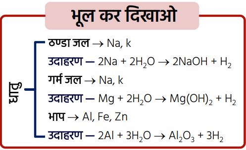 नोट — लेड (Pb), कॉपर (Cu), सिल्वर (Ag), गोल्ड (Au) धातुएँ जल से बिल्कुल अभिक्रिया नहीं करती हैं।