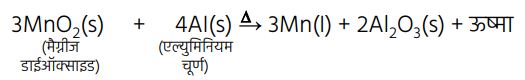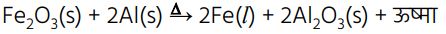 5. Fe₂O₃ (s) + 2Al (s) → 2Fe (l) + Al₂O₃ (s) + ऊष्मा(आयरन (III) ऑक्साइड)इस अभिक्रिया का उपयोग रेल की पटरी व मशीनों के पुर्जों की दरारों को जोड़ने के लिए किया जाता है।