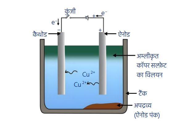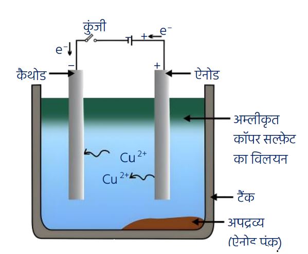 धारा प्रवाहित करने पर ऐनोड पर स्थित अशुद्ध धातु इलेक्ट्रोलाइट में घुल जाती है, तथा उसी मात्रा में शुद्ध धातु कैथोड पर जम जाती है।