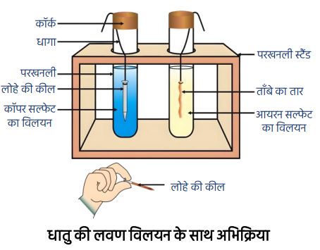 याद रखें — पोटैशियम तथा सोडियम धातुओं को केरोसिन तेल में डुबाकर रखा जाता है क्योंकि ये धातुएँ अत्यधिक सक्रिय होने के कारण खुले में आग पकड़ लेती है।