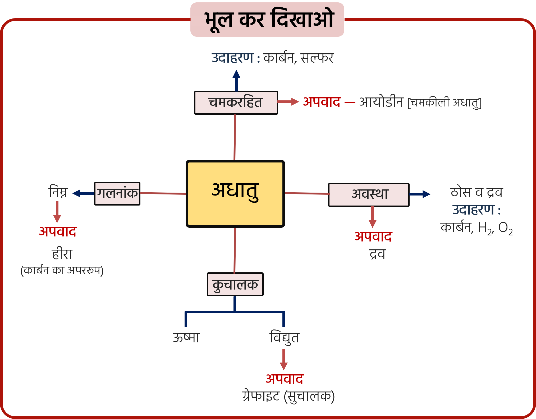 | 1. | चमकदार होते हैं। जैसे– सोना, चाँदी | चमकदार नहीं होते हैं। जैसे– कार्बन, सल्फर अपवाद – आयोडीन |