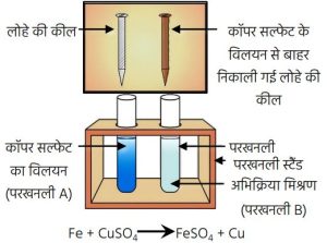 प्रयोग से पहले तथा उसके उपरांत लोहे की कील तथा कॉपर सल्फेट के विलयन की तुलना