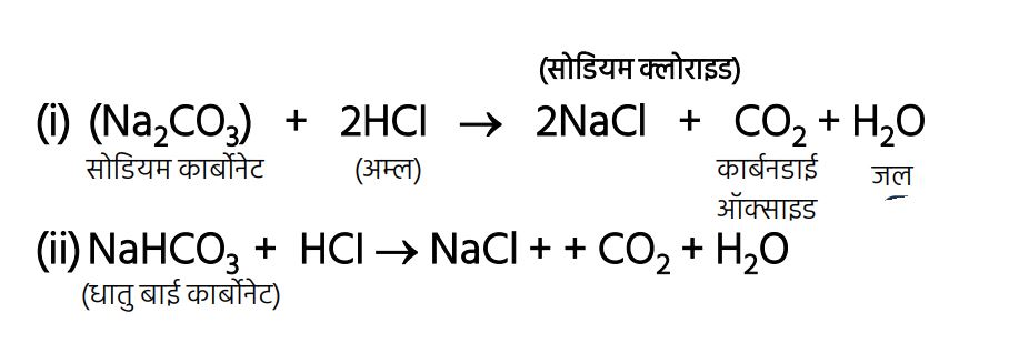(ii) जब बेकिंग सोडा को किसी अम्ल के साथ अभिक्रिया कराई जाती है, तो कार्बन डाइऑक्साइड गैस बनती है।