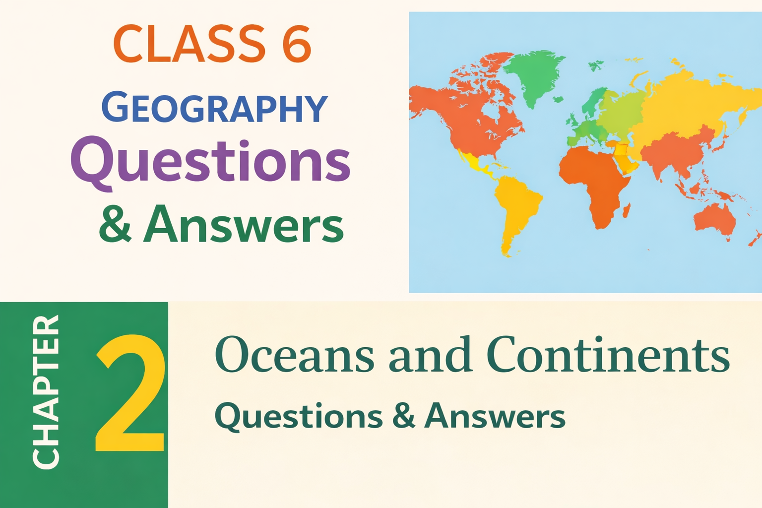 Class 6 Geography – Chapter 2: Oceans and Continents (Questions & Answers) This article provides easy, exam-oriented answers for Class 6 Geography Chapter 2 – Oceans and Continents. The explanations are written in simple language, strictly aligned with the NCERT syllabus, and ideal for quick revision, homework, and exams. Question 1. Explain the following terms: (a) Continent A continent is a very large and continuous landmass that forms a major division of the Earth’s surface. There are seven continents on Earth:Asia, Africa, North America, South [...]